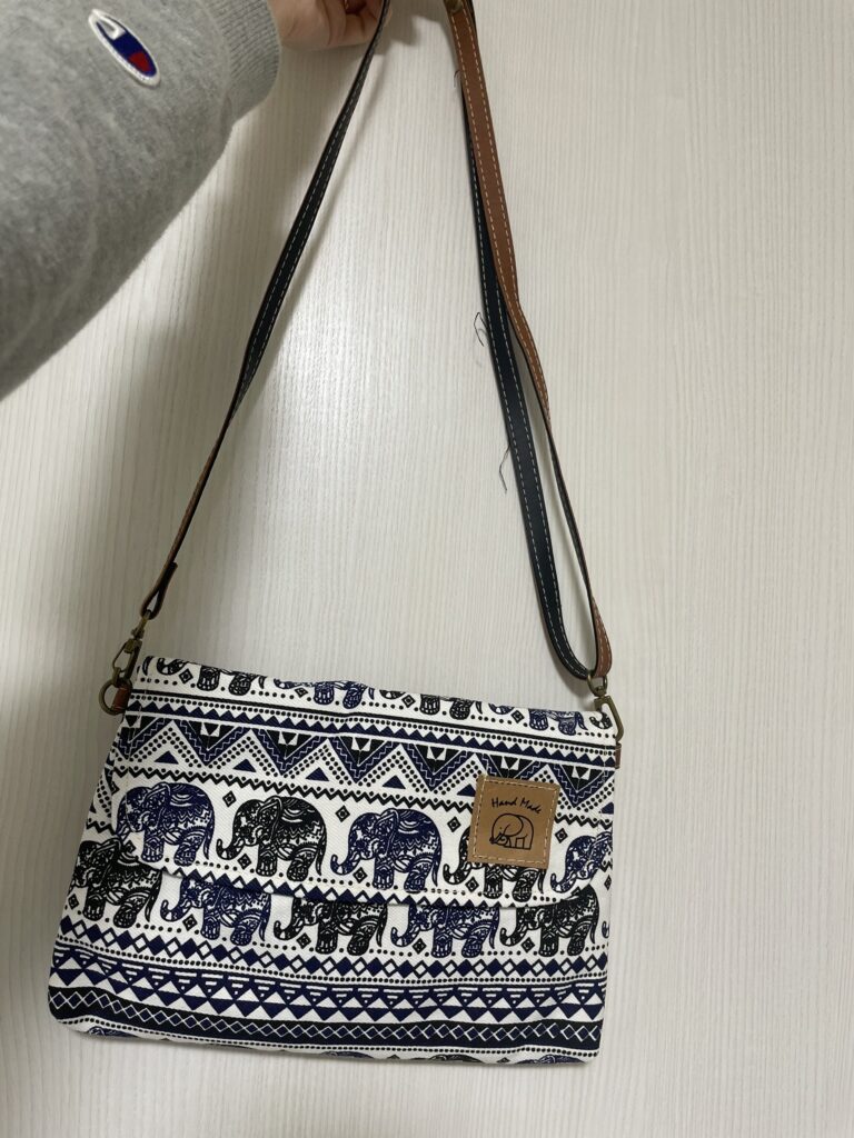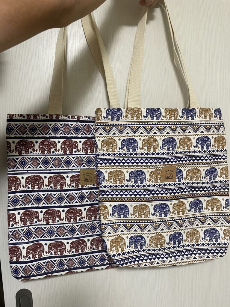 とっても可愛いゾウの柄のトートバック。可愛さに惹かれ、見た瞬間絶対買う!と即決し、自分用と家族へのお土産用に2つ購入しました。A4サイズのクリアファイルが余裕で入るぐらいの大きさです。これよりもっと大きいサイズのもありました。